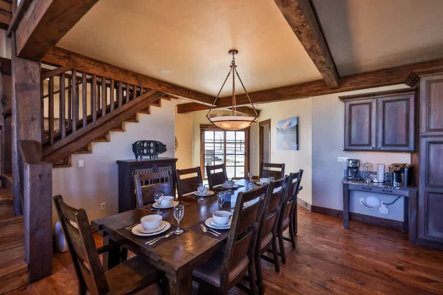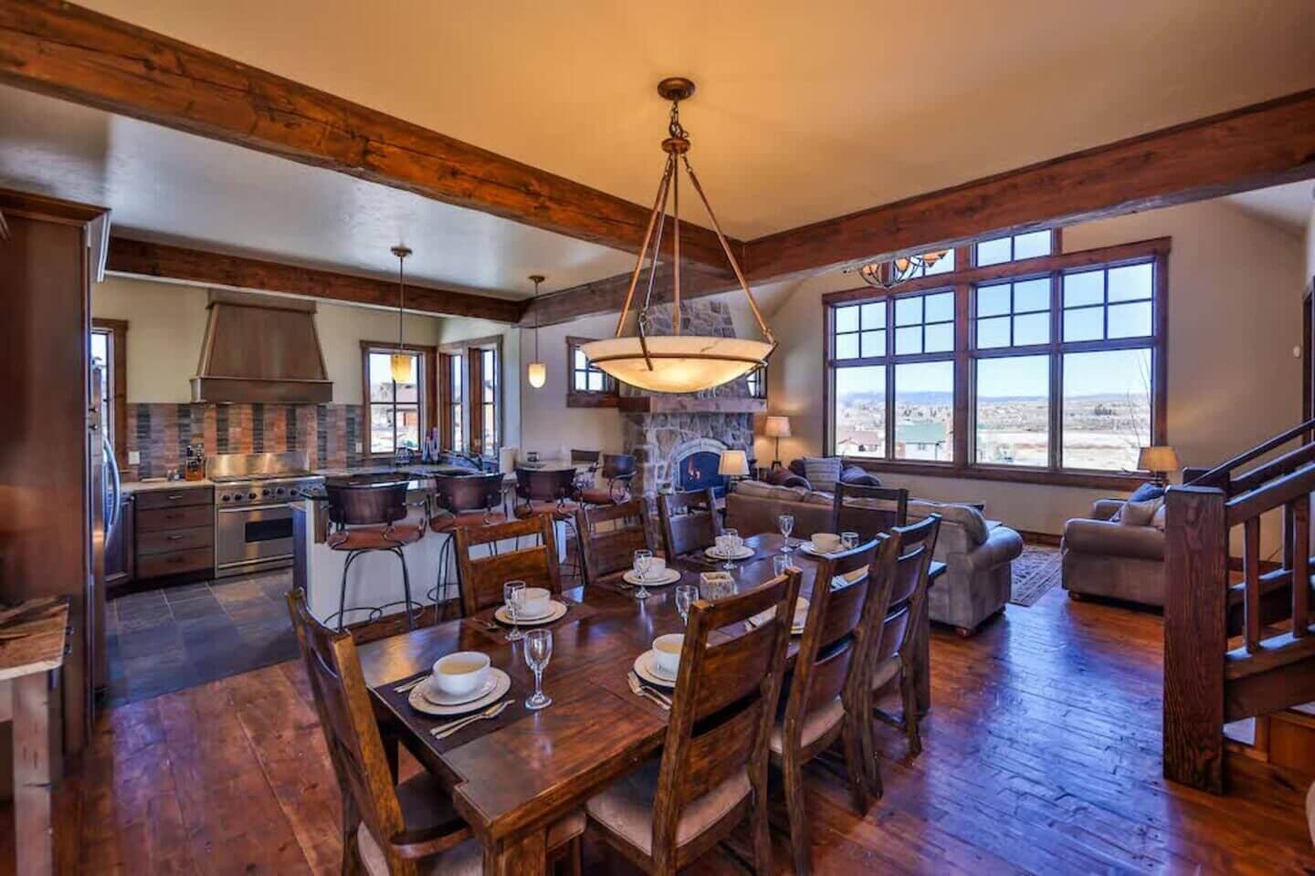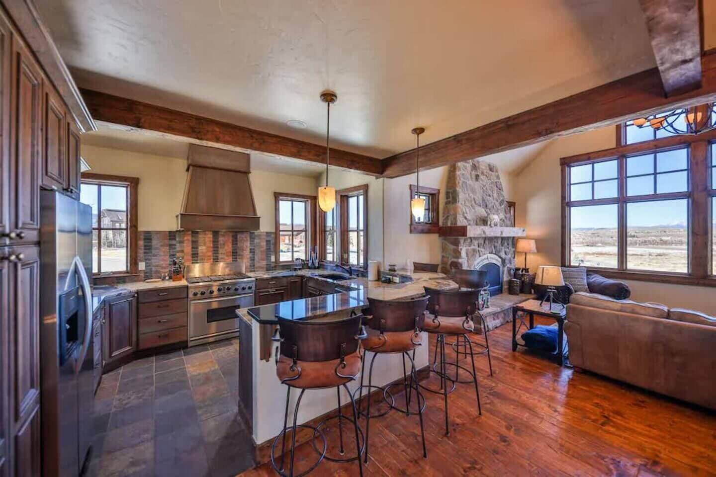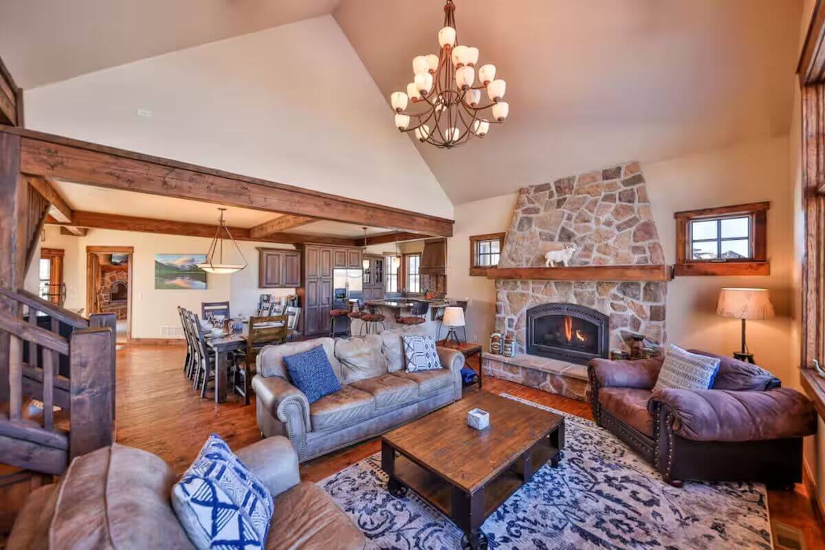 Offering a warm welcome to family and friends, Saddle Ridge Lodge touts high-end, family-friendly finishes throughout. Spend the days on the slopes or golf course and spend the evenings soaking in the private hot tub or competing in a game of foosball. The spacious layout is perfect for families and groups with two living rooms, a playroom, gas fireplaces, a high-end kitchen, and a large patio with a grill, egg smoker, and a hot tub. What’s more? Your dog can join in on the fun, too!