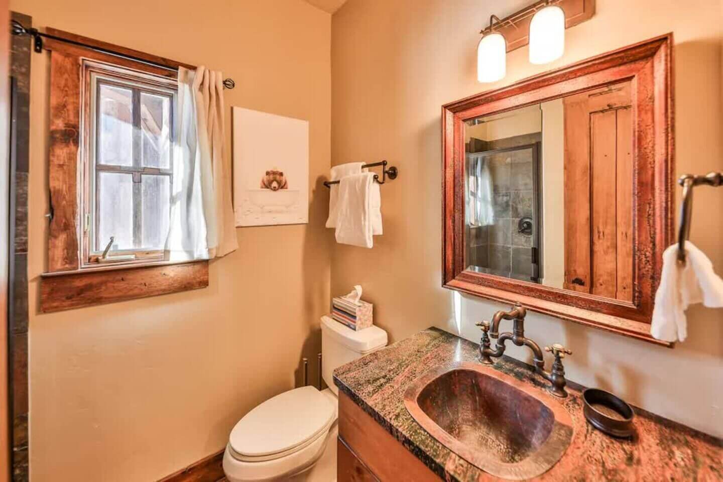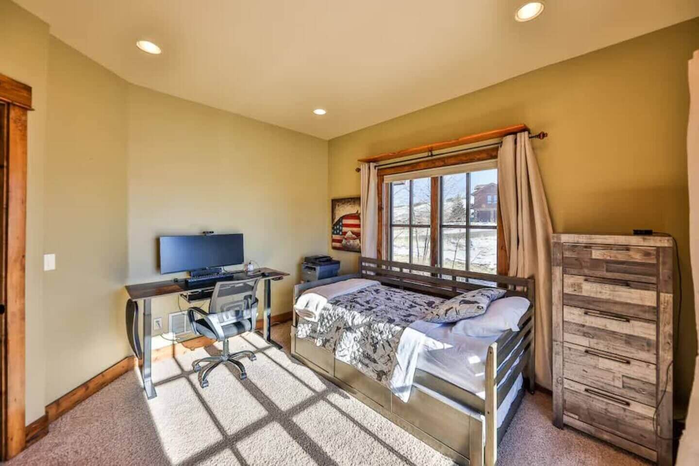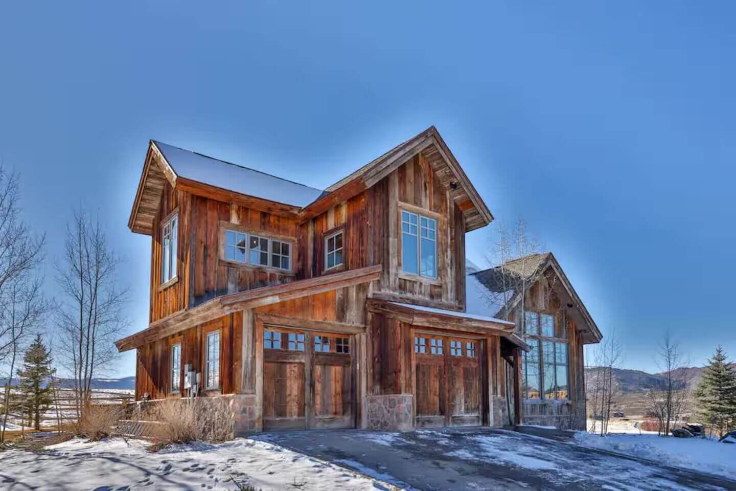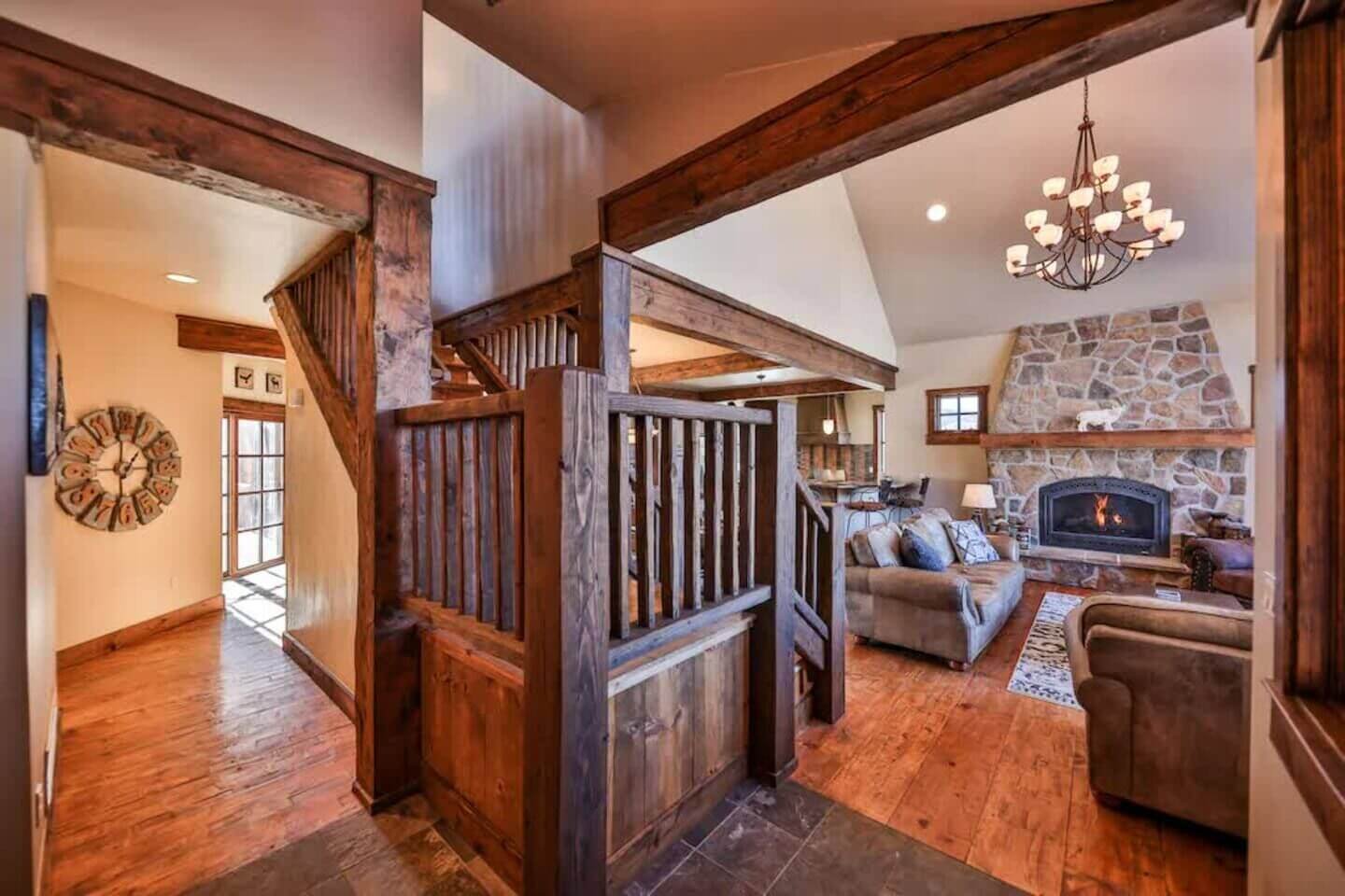 Pull up to the barnwood home and into the convenient two-car garage. As you make your way inside to the main level, you will be welcomed by warm furnishings and an open floor plan. The main level was designed for gathering with a modern kitchen supplied to please the most discerning chef in your group. The kitchen opens to the dining area with a wooden table to seat eight comfortably and additional seating at the breakfast bar. Make your way to the living room with a cup of Joe to warm up by the fireplace and catch up on your favorite book. The main level also hosts the stunning main bedroom with a gas fireplace, television, and access to the patio. The spacious en-suite features a soaking tub, dual vanities, a standing shower, and huge walk in closet. The second bedroom on the main level has a twin bed with a twin trundle and seconds as an office. Plug into the docking station to catch up on some work and then get back to the fun! There is a three-fourths bathroom on this level as well.