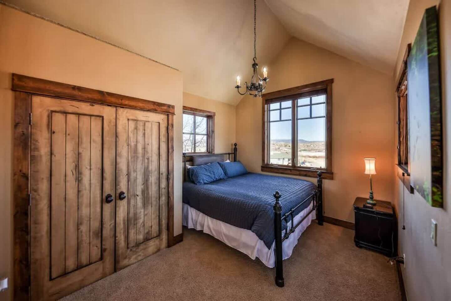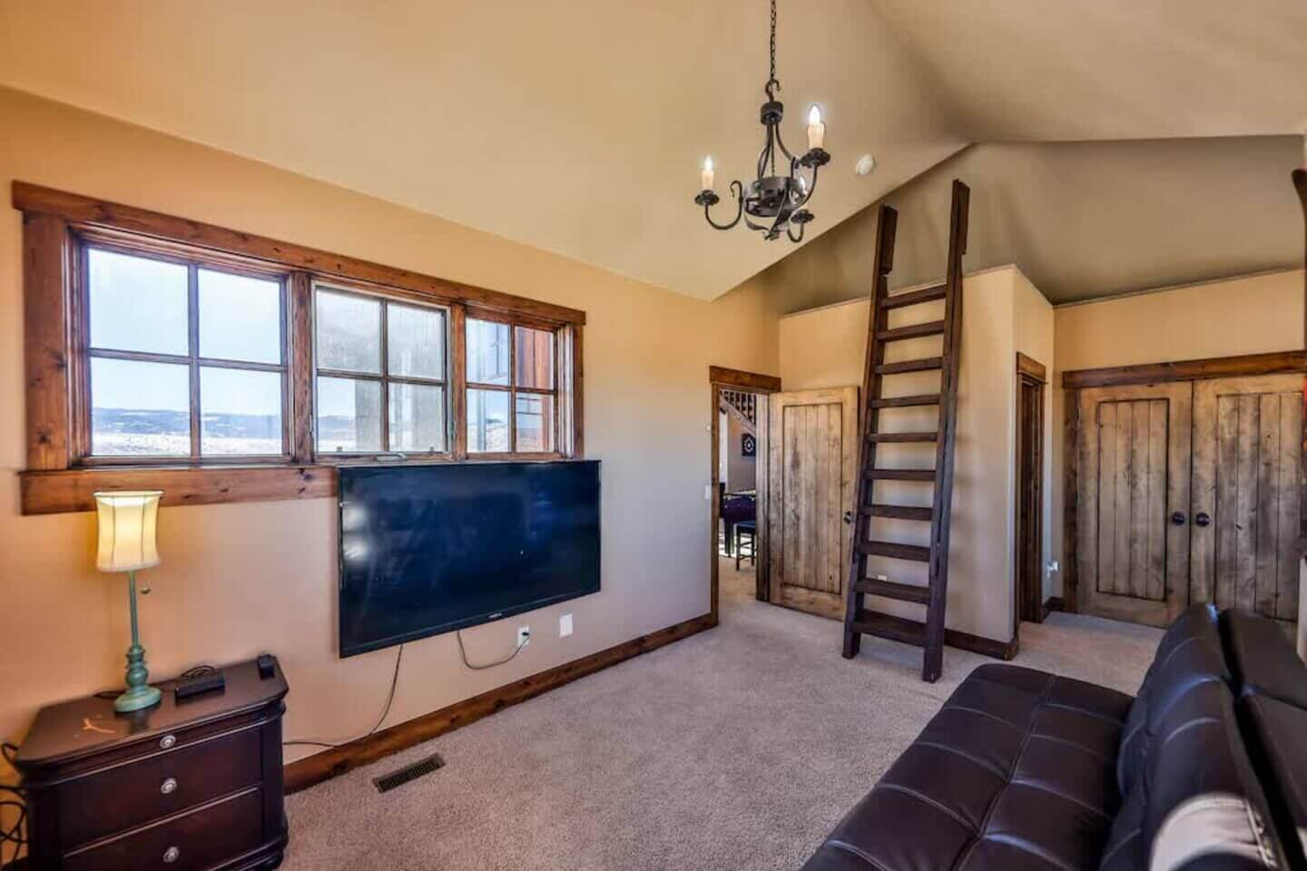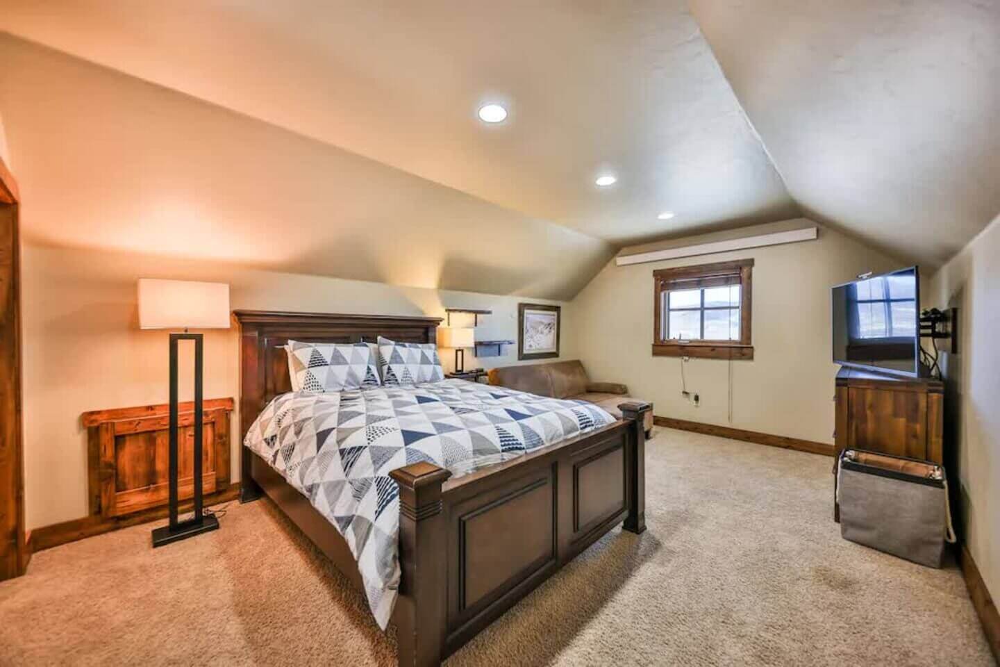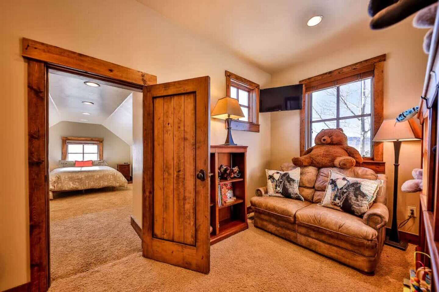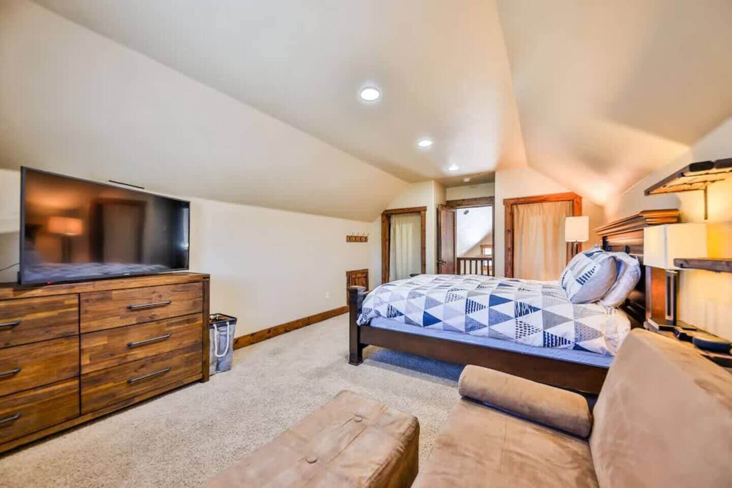 Up one more level, a private bedroom with a full bed and a 55” smart TV rounds out the six bedrooms.