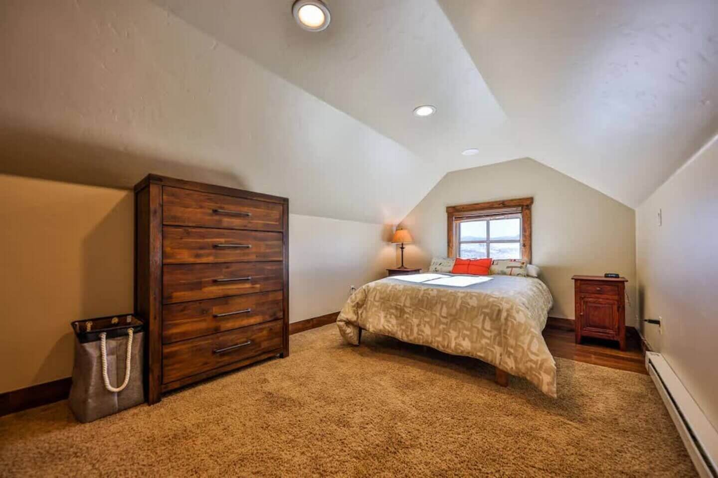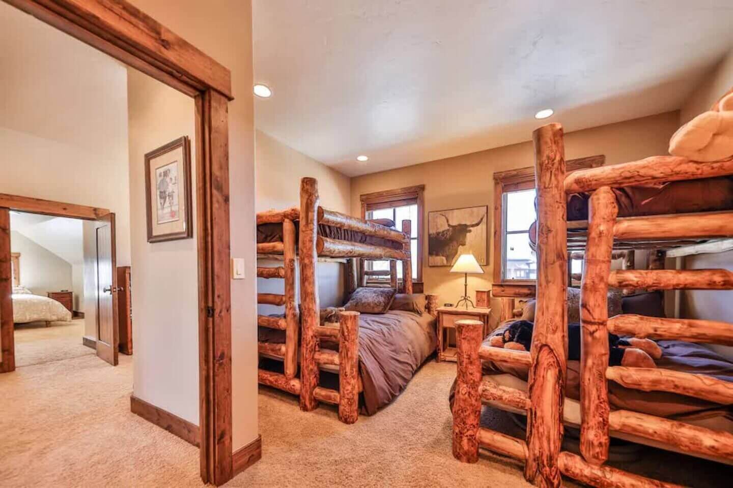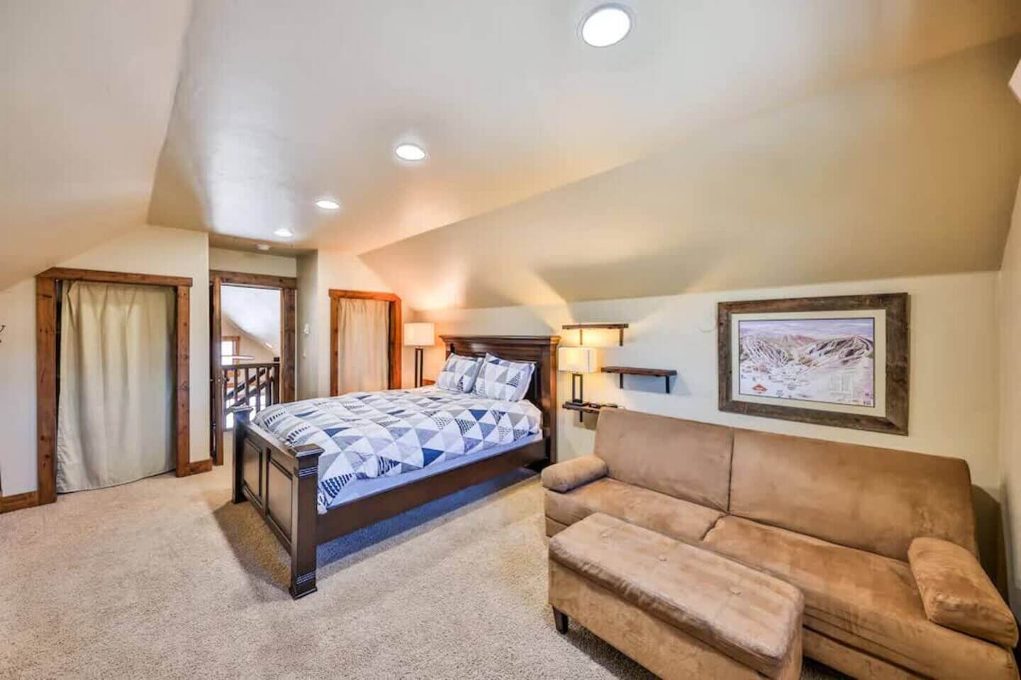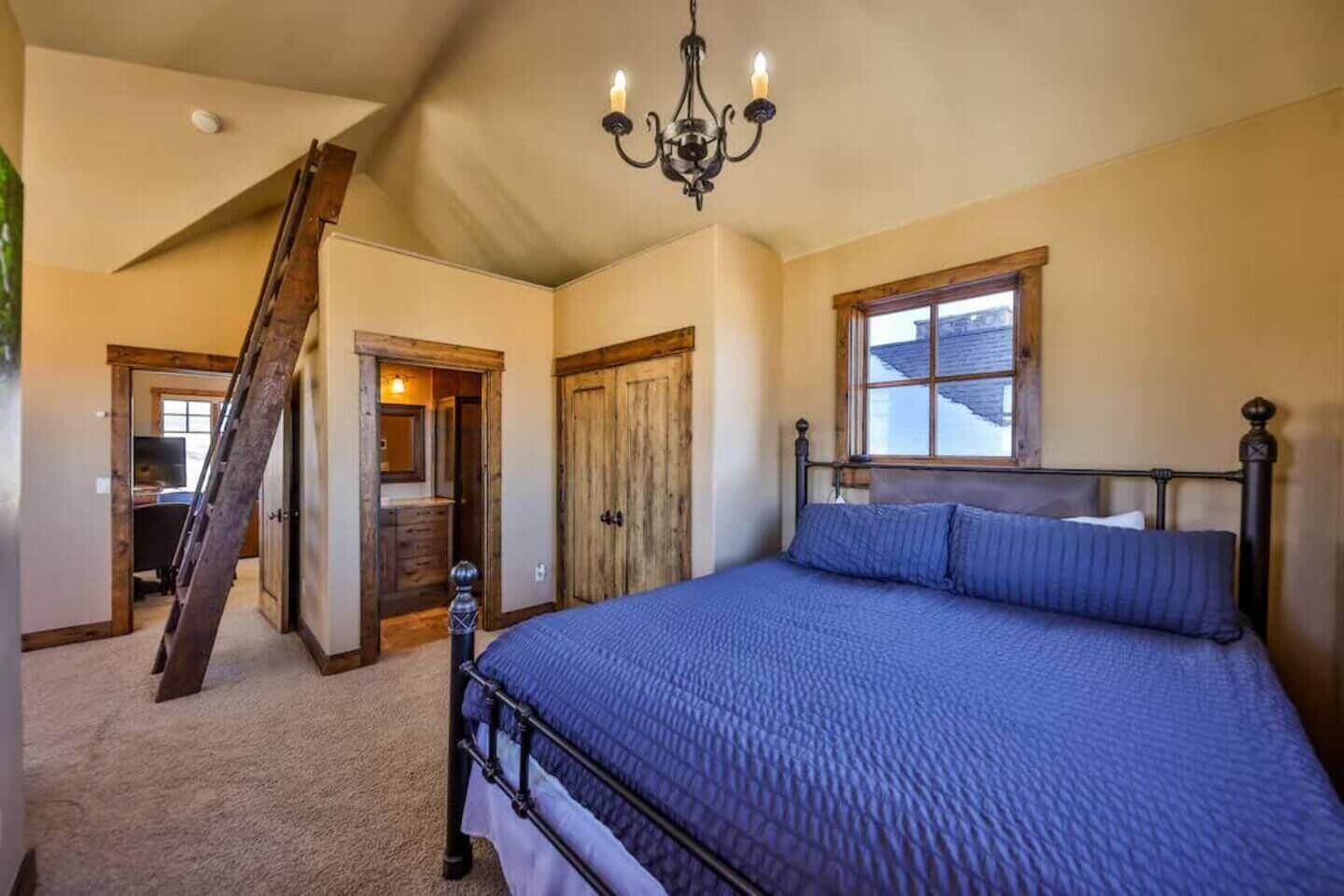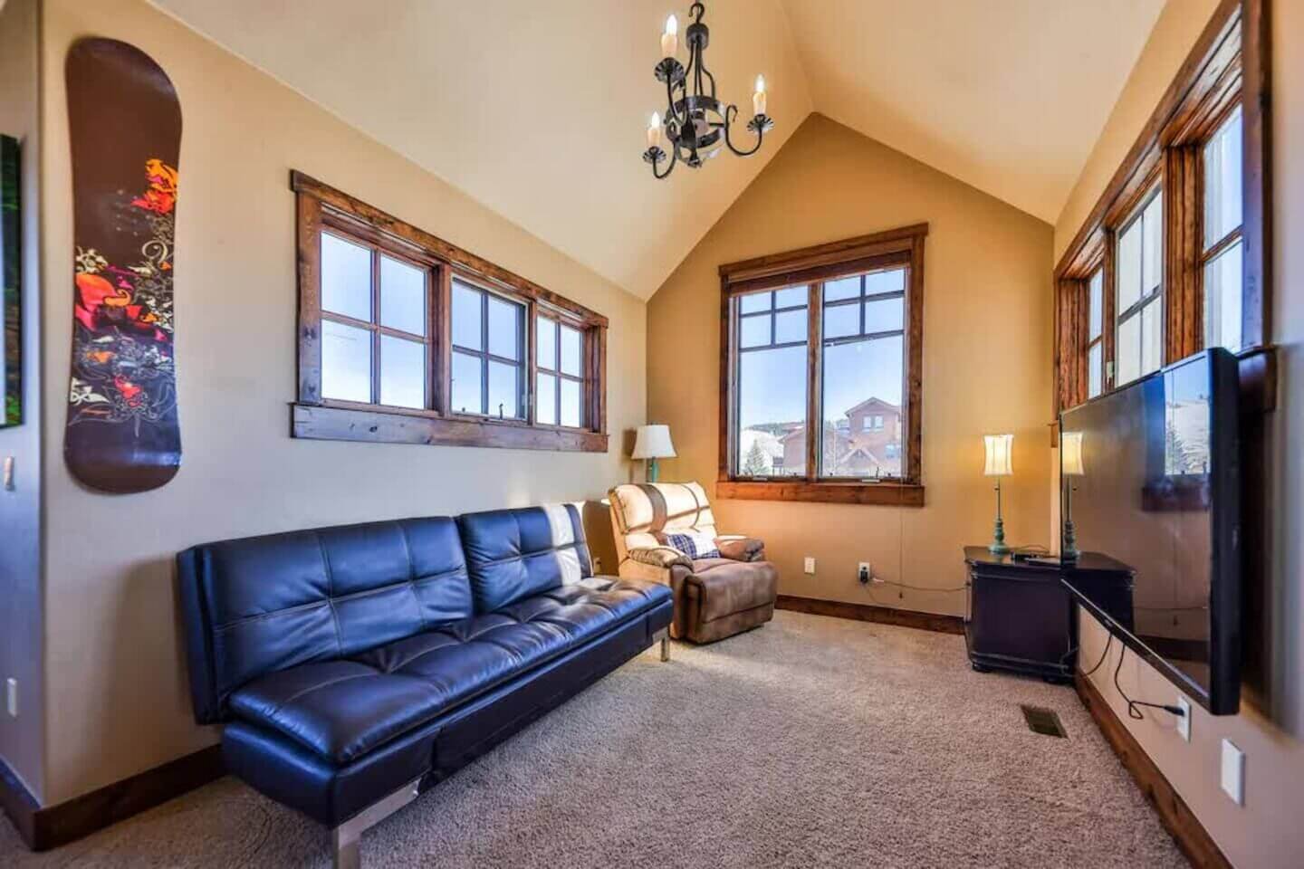 Up one more level, a private bedroom with a full bed and a 55” smart TV rounds out the six bedrooms.