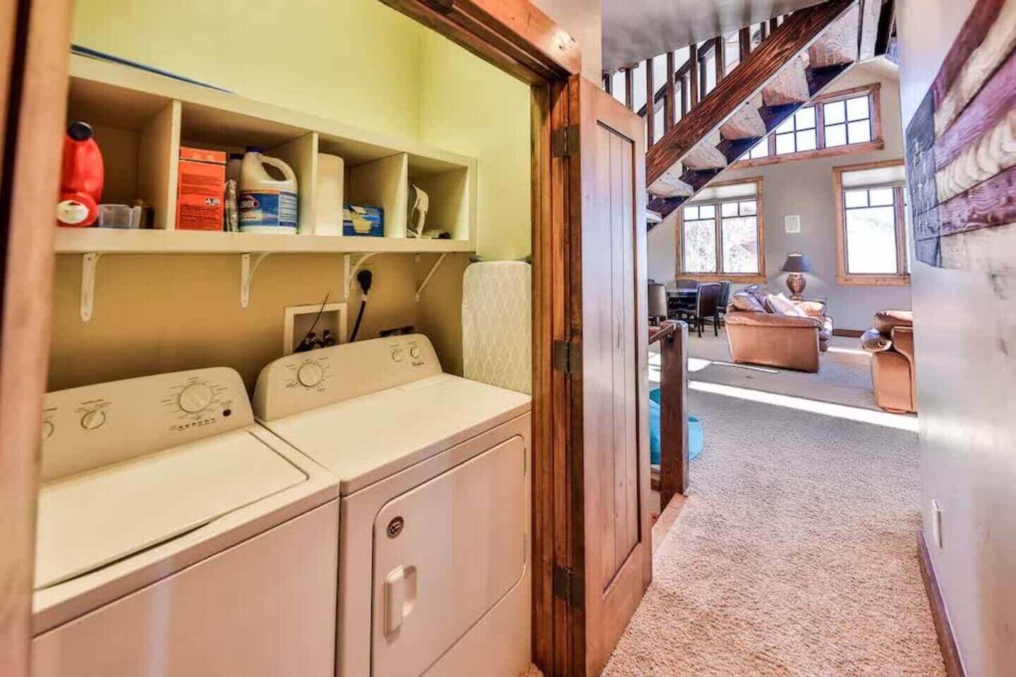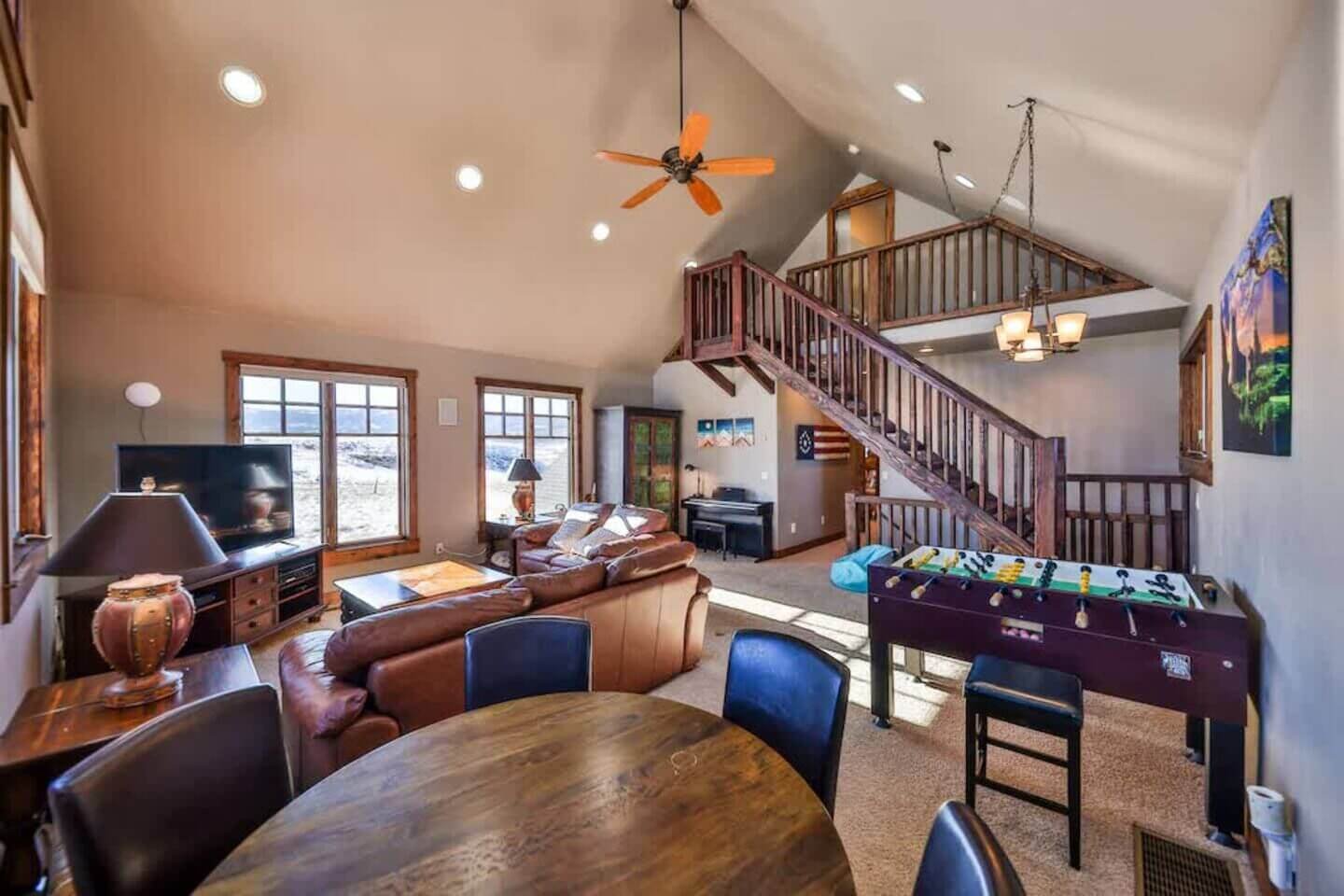 Take a walk upstairs to the living room with a 65” smart television, foosball, electric piano, and card table. This level is host to the second king suite with a futon and large smart TV. Past the laundry closet is a playroom fit for the “littles” with a small TV. On opposite sides of the playroom are two more bedrooms. One with a full bed and the other perfect for the kiddos with two twin over full bunk beds. These bedrooms share a full bathroom.